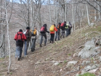 Continuem pujant fins arribar al Coll Joell (848m), situat en el Cingle de les Manrades, petit replà on quasi no hi cabem i desprès d’admirar els penya-segats que tenim al costat, ens disposem a recuperar forces amb un petit esmorzar. Seguim la ruta, ara quasi planera i de baixada pel Bac de Can Barrufa fins arribar a les Jaces Velles. El camí es ple d’arbres caiguts que ens obliguen a fer de contorsionistes. Bé, però no hi ha dificultats extres. Suaument tornem a pujar fins arribar al Escaler del Joc. Aquí el camí presenta una mena d’escalons fets amb pedra que ens ajuda a passar un desnivell realment important. Es bonic de veure i de passar-lo. Al cap de poc arribem a Les Baumes d’Uja, un petit tresor d’aquests que resten amagats a l’Alta Garrotxa. El paratge es feréstec i la font que l’acompanya ( l’aigua surt de la roca) li dona un aspecte encara mes bucòlic. Desprès de reposar i gaudir del lloc, continuem cap el Coll de la Balmeta passant per sota les muralles del Pic de Sant Marc, enmig de una fageda espectacular on el sender passa prop del caire, amb uns penya-segats que val mes no acostar-s’hi gaire, però l’espectacle de la natura es impressionant.